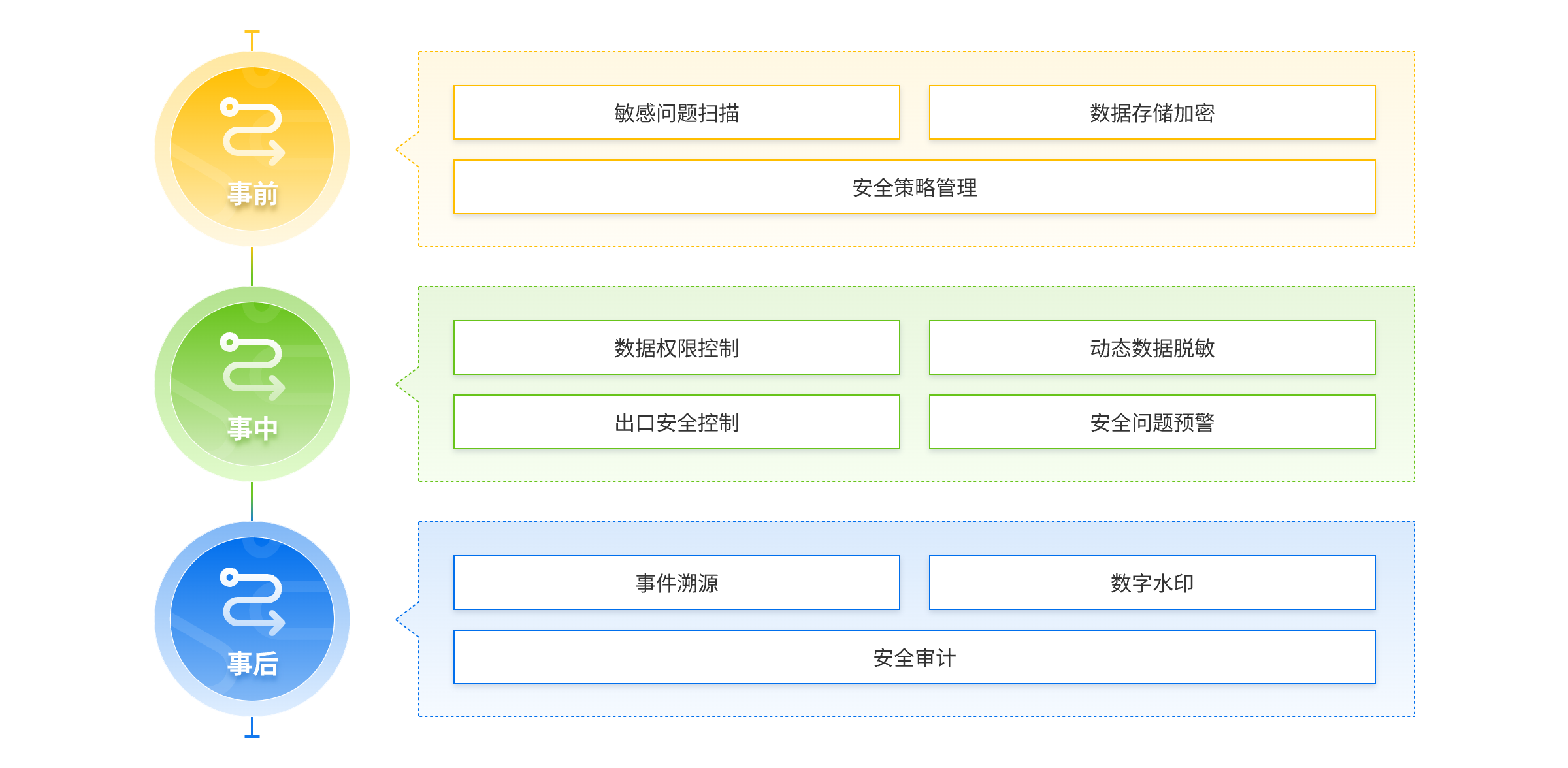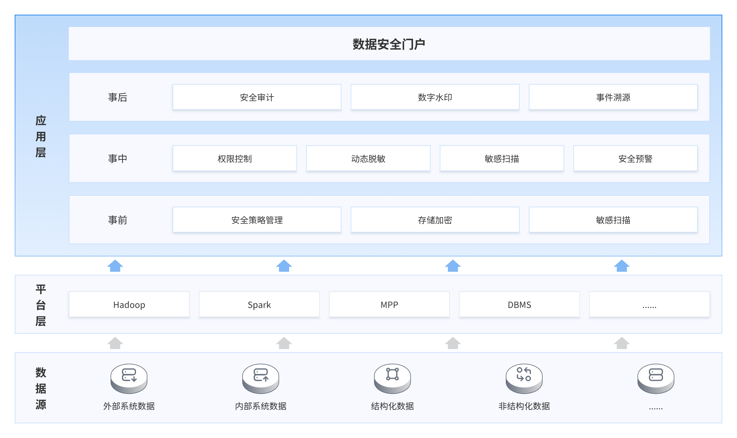 達普信數據安全平臺,幫助企業客戶建設數據安全防護體系,為大數據平臺提供體系化的安全策略。通過事前數據安全管理、事中數據安全控制和事后數據安全管控多種手段保障。