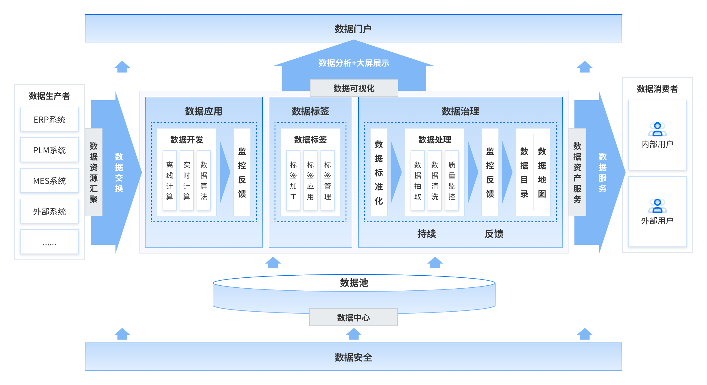 數(shù)據(jù)安全:通過對(duì)事前、事種及事后數(shù)據(jù)安全的管理,保障數(shù)據(jù)中臺(tái)的數(shù)據(jù)在交換、存儲(chǔ)及服務(wù)過程的安全使用
