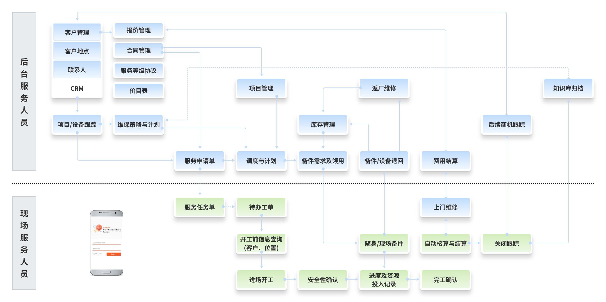 達普信針對新能源行業的業務特點,以面向客戶需求的業務管理為核心,設計研發了新能源行業售后服務ITR平臺解決方案,包括: